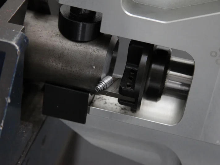 Подача матеріалу здійснюється за допомогою маховика. Верстат оснащений швидкозатискним важелем та затискними губками різних розмірів залежно від діаметра труби.